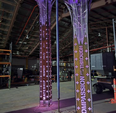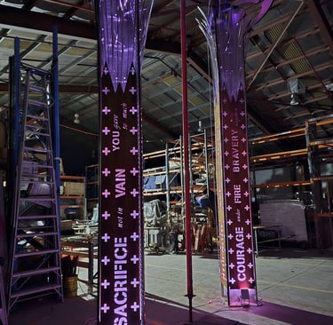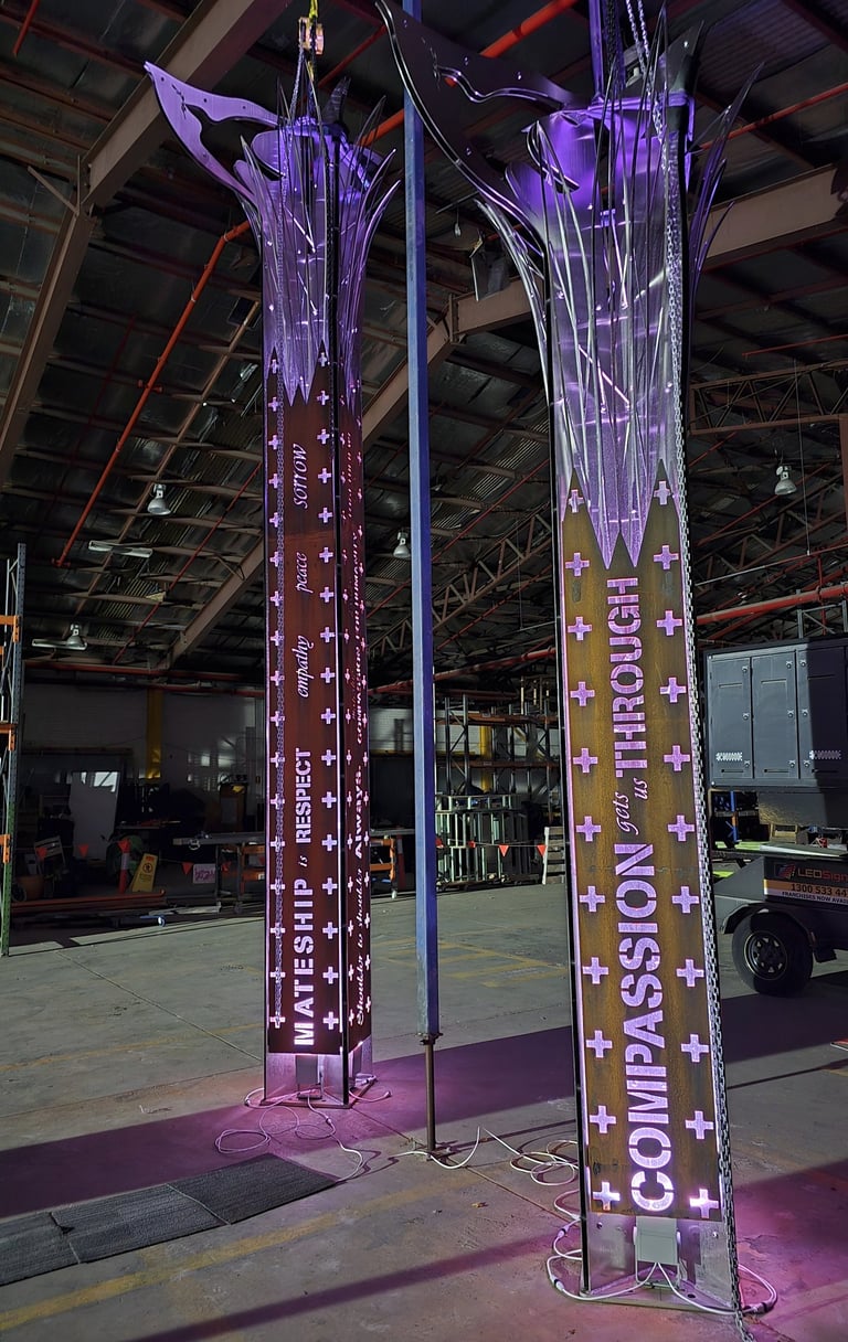 The Gympie Memorial Pillars were designed to compliment the Memorial Flame as a tribute to the military service people in Gympie and surrounds. They represent the four RSL Service Values: Courage, Sacrifice, Mateship and Endurance. The words etched onto each pillar were written to evoke personalised story-telling and memories for individuals and families connected to these service men and women.