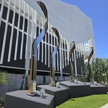 The sculpture is an acknowledgement of the four RSL Service Values: Courage, Sacrifice, Mateship and Endurance. It was commissioned by Bribie Island RSL and Rubicon Design and Construct as a way to honour and acknowledge the sacrifices made by service men and women in this region. The spiral design is used to evoke hope and optimism and compliment the wave and design of the RSL club facade. COR-TEN and stainless steel create a juxtaposition representing the opposing forces of peace and conflict.
