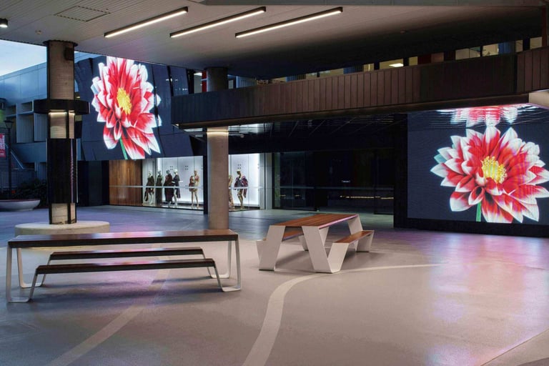 State-of-the-art, interactive, touch screen and wireless - these screens allow students from the film and multi-media department to upload their latest creative projects. Remo designed for fabrication 6m x 12m aluminium frames to house 2 new translucent LED screens in a faceted format.