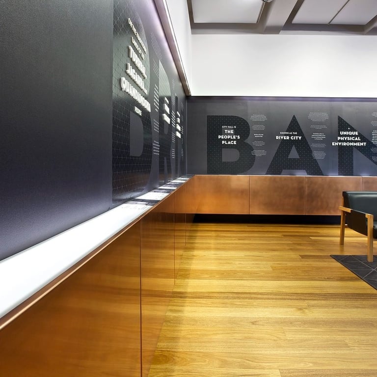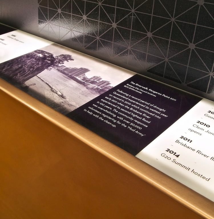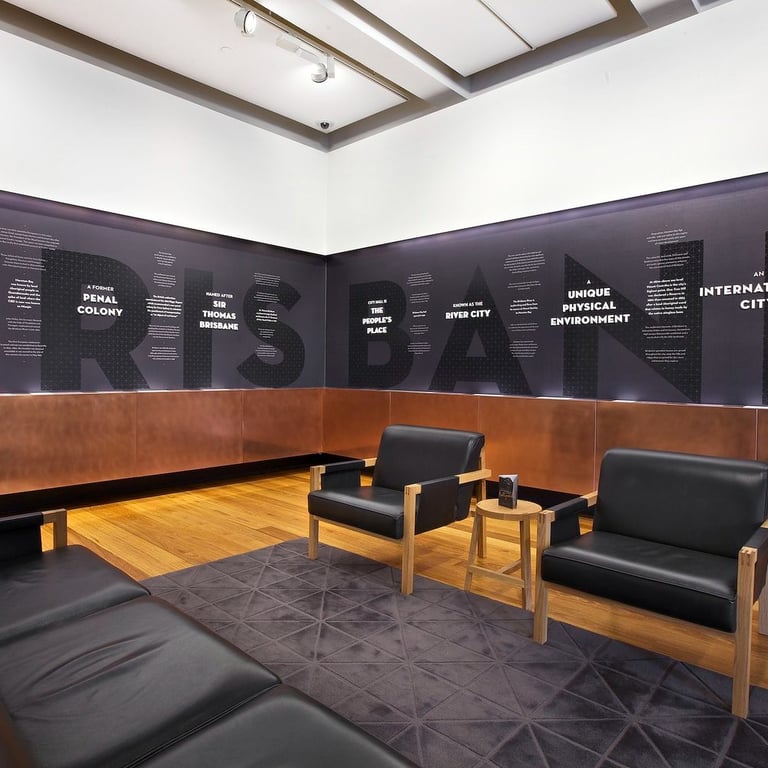 Solid copper paneling exhibition in Museum of Brisbane. The exhibition wraps around the room, the copper panels act as a plinth as well as creating warmth for the customer lounges.