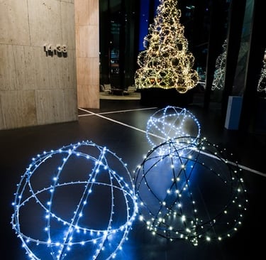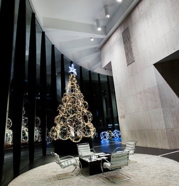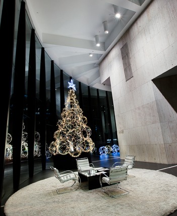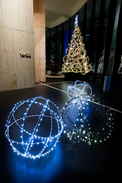 This 5.5 metre Xmas Tree made from steel half spheres and covered in high quality LED. The tree floats in Riparian Foyer for just 6 weeks of the year. It has been a Christmas fixture in the foyer since 2010.